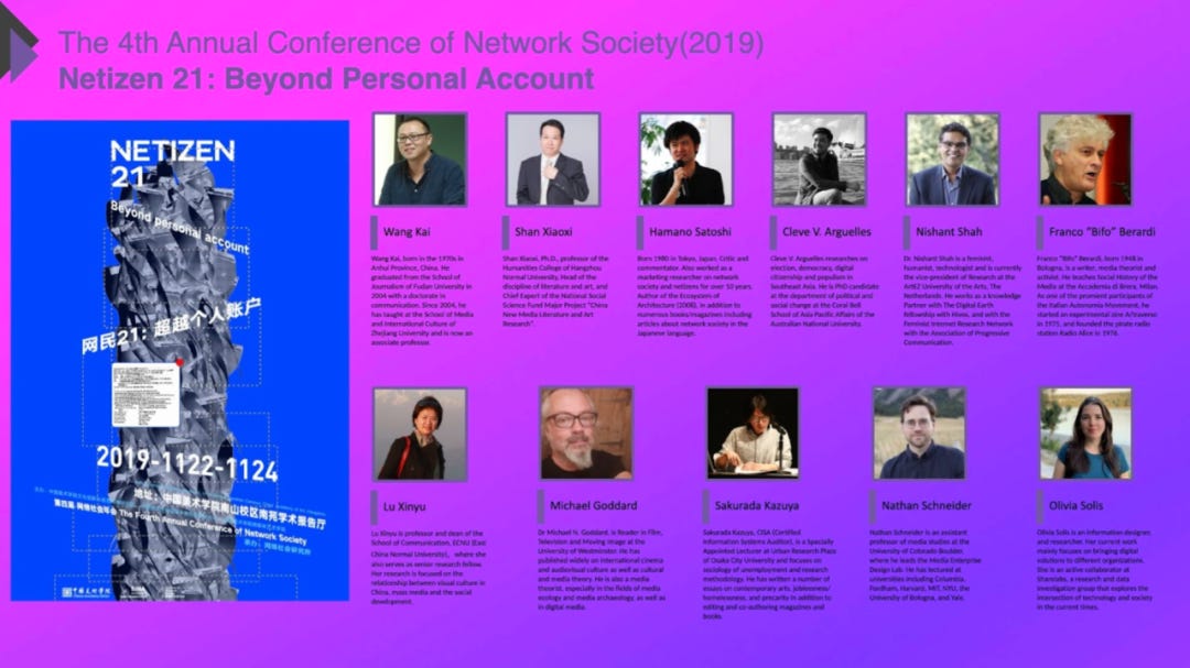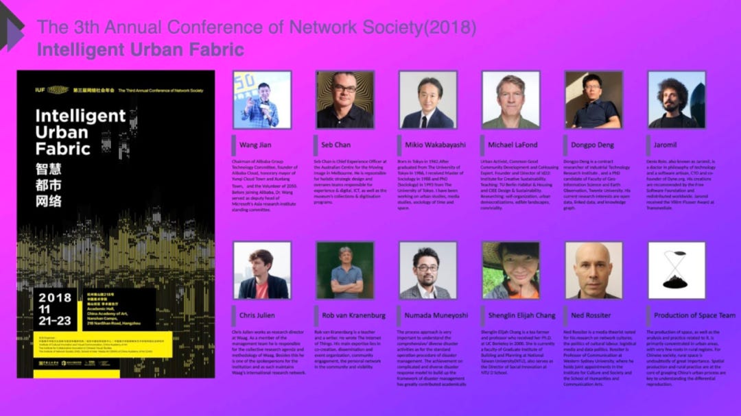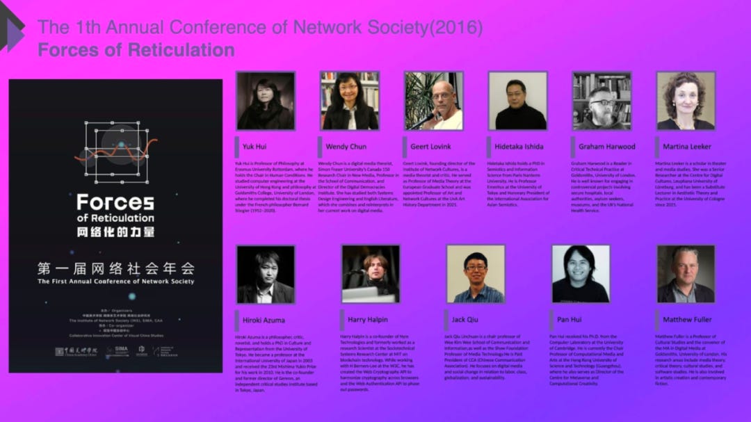首先我想跟各位介绍一下我们这十年来做了什么。网络社会研究所是一个独立的研究机构,得到了中国美术学院跨媒体学院的大力支持。我们建立了一个国际化的教学团队,合作伙伴包括众多艺术家、策展人、设计师以及国际知名学者。我们的第一届年会主题为“网络化的力量”(Forces of Reticulation)。每一年,我们都会邀请大约10到12位杰出的学者参与我们的讨论和分享。