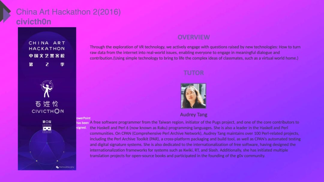 这是我们第二届的hackathon。在2016年,我就联合了台湾台北的艺术大学,高雄的高雄师范大学,跟杭州美院的跨媒体学院且搞线上课程,开发VR实验。邀请了唐凤来授课,她是全球知名的黑客,后来成为台湾的数位部长。他带着两岸三地的学生,以开源程序与平台领导了现在非常流行的AR或VR的设计。所有的人都可以去不同的”校园”上课,学习怎么操作VR软件与制作VR环境,