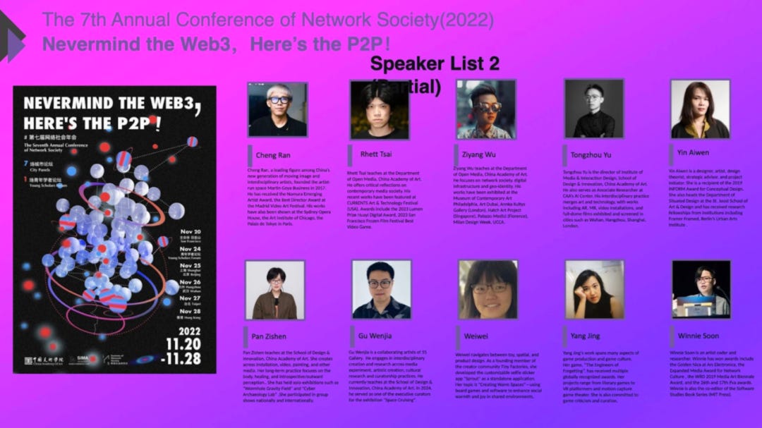 第七届我们叫做,也许你们都知道这是来自一个很有名的乐团的一个说法,“Never Mind the Queens”(性手枪乐队1977年的专辑《Never Mind the Bollocks, Here’s the Sex Pistols》), “Never Mind the Web3,Here is the P2P”。所以这一年我们邀请了Internet Archive的创始人布鲁斯特·卡利(Brewster Kahle),以及香港AAA(亚洲艺术文献库)的主理人等专家,共同探讨P2P技术的现状与未来。第七届比较特别的是,由于疫情之故,除了旧金山主论坛以外,我们还在亚洲的6个城市同时举办分论坛,包含武汉、杭州、上海、香港、北京,台北。这是我们所有的论坛嘉宾,是我们第一次尝试通过城市的P2P来做城市群体连接的关系。