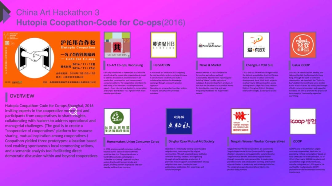 然后这是在上海办的第一次,我们叫做coopathon(合作松)。Cooperation and hackathon绑在一块,为了合作社,我们邀请了亚洲非常多的合作社组织一起购买,包含日本、韩国、印度尼西亚、台湾等地,并考虑在技术发展的过程里,合作社跟程序员可以一起做什么样的事情。所以这是比较特别的一个系列。
