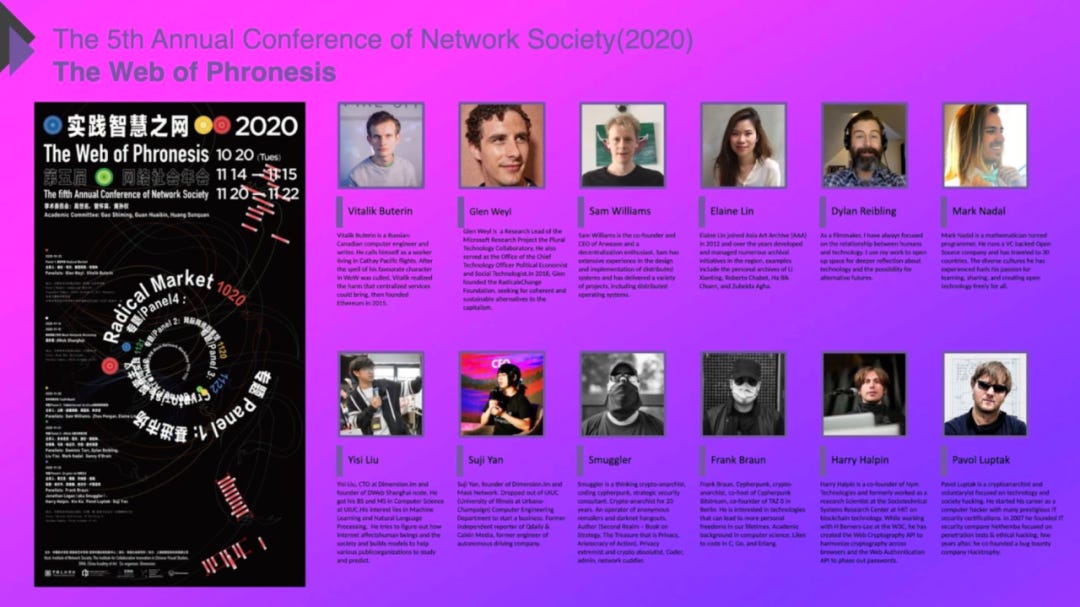 第五届2020年叫做“实践智慧之网”,这个是比较面向真实社会的实践聚会,邀请了一波在区块练与加密技术的各种实践者相聚,如Vitalik(以太坊创始人)等人找来,也有来自捷克crypto punks(加密朋克)。对现实的干预,未来的想像绘制了当前的,足以想像的路径。