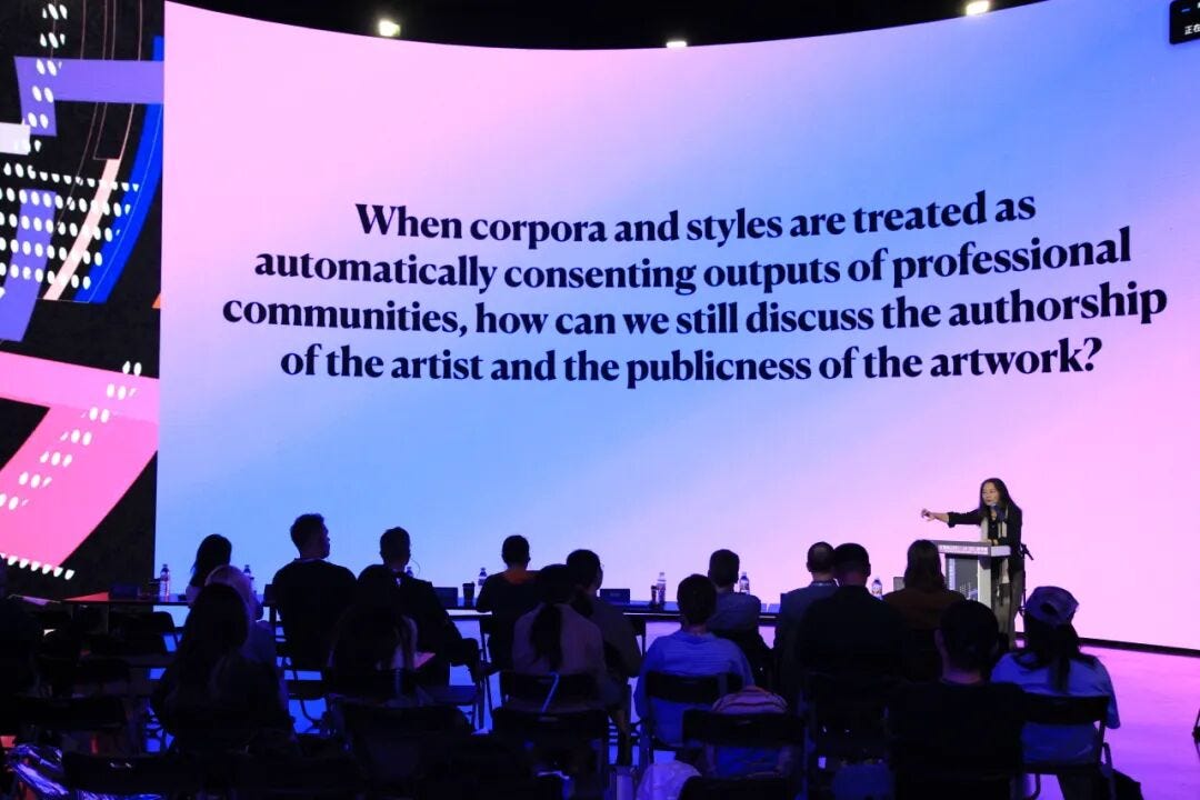 第四个Panel 是 When the Work is Prompt(“当作品就是提示”),这是我们艺术家最关心的事情,我们昨天请了罗霄先生来演讲。他作为一个算法艺术家,一直坚持说,即便你用 AI 创作,还是保有艺术家的主体性的。所以他举了很多例子。我相信这两天的会大家会告诉我们更多这样的故事。我们怎么思考艺术家的主体性?当我们在用 AI 创作的时候,我们到底还算不算艺术家?我们有没有作者性?艺术性又从合而生,如果不是出自人类之手?
