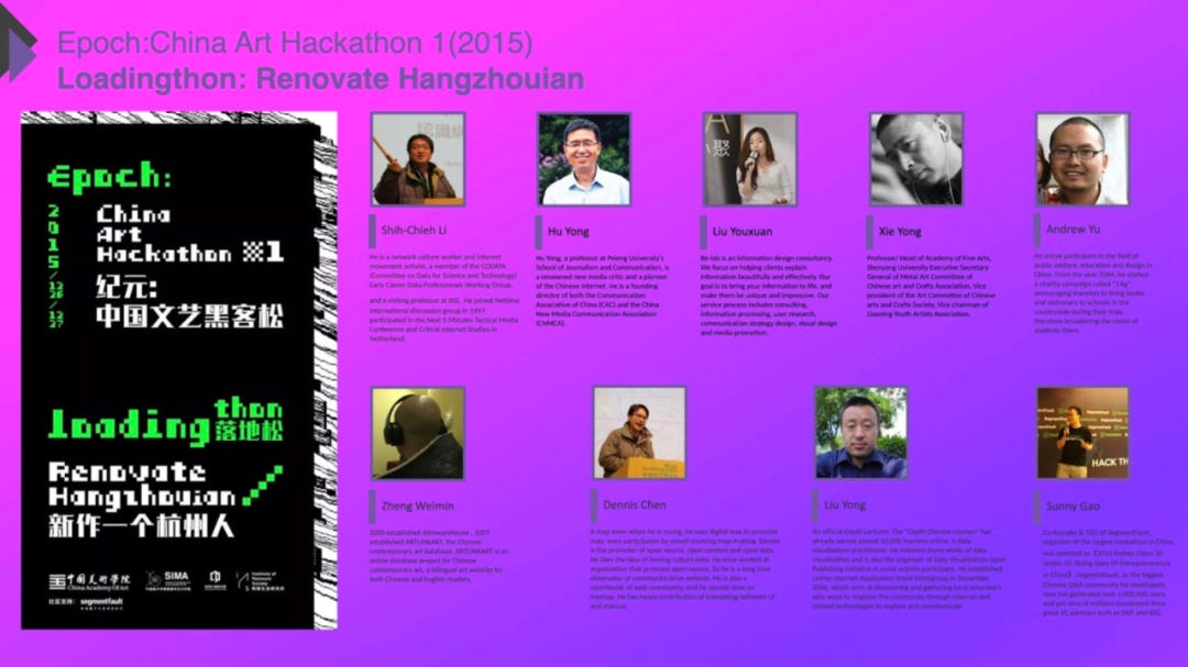 除了年会之外,我们还举办了非常多hackathon(黑客松)。我们搞的hackathon不是非常technical的hackathon,我们叫做art hackathon(文艺黑客松),所以会找很多艺术家、策展人、设计师,甚至项目管理者、博物馆馆长这种角色一起来做hackathon。每一年都有一些非常不一样的尝试。
